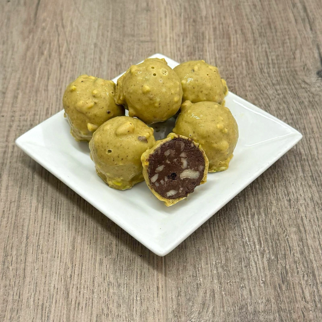 Ingredientes: Chocolate Negro Sin Azúcar, Huevos, Claras Batidas, Harina de Almendras, Nueces, Manteca Ghee, Chocolate Blanco sin Azúcar, Pasta de Pistacho, Pistacho picado